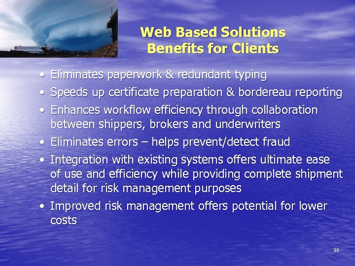 Web Based Solutions Internet Marine Cargo System Functionality • Policy issuance / accessibility • Certificate generation with policy compliance validation & automated referral workflow for special-case shipments • Shipment/storage declarations and premium calculation (Marine, War, Storage, Vessel Penalties and taxes) • First notice of loss entry and claim status reporting • On-line claims file for settling agents, brokers & assureds • Flexible exception-based alerts, emails and reporting • Real-time underwriting control over policy conditions, limits, rates and access • Automated billing, payment and receivables management • Sophisticated data analysis & reporting tools • Detailed audit trail • Clause library and reference table lookups to speed entry 29