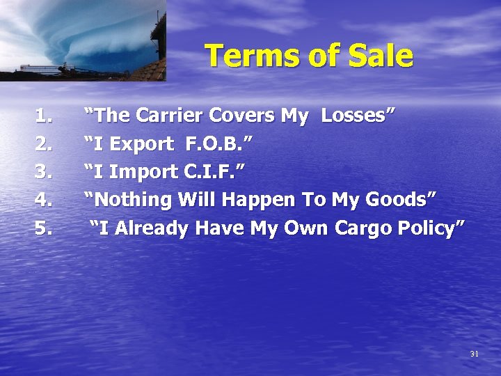 Terms of Sale 1. 2. 3. 4. 5. “The Carrier Covers My Losses” “I Export F. O. B. ” “I Import C. I. F. ” “Nothing Will Happen To My Goods” “I Already Have My Own Cargo Policy” 31
