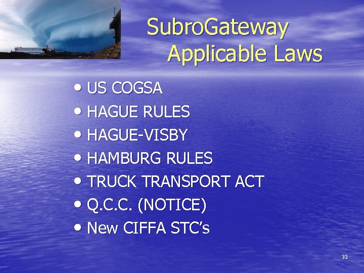 Subro. Gateway Applicable Laws • US COGSA • HAGUE RULES • HAGUE-VISBY • HAMBURG RULES • TRUCK TRANSPORT ACT • Q. C. C. (NOTICE) • New CIFFA STC’s 32
