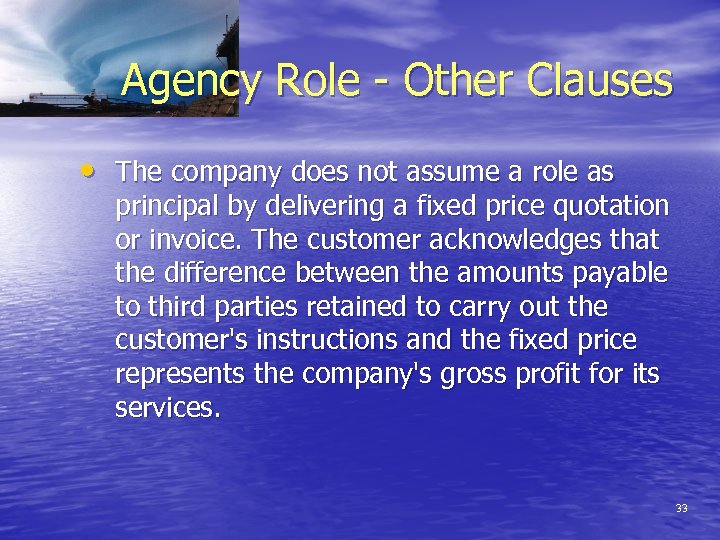 Agency Role - Other Clauses • The company does not assume a role as principal by delivering a fixed price quotation or invoice. The customer acknowledges that the difference between the amounts payable to third parties retained to carry out the customer's instructions and the fixed price represents the company's gross profit for its services. 33