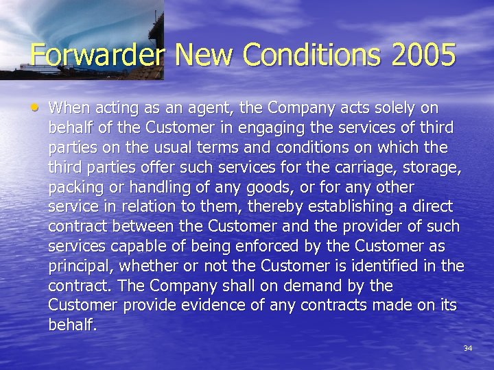 Forwarder New Conditions 2005 • When acting as an agent, the Company acts solely on behalf of the Customer in engaging the services of third parties on the usual terms and conditions on which the third parties offer such services for the carriage, storage, packing or handling of any goods, or for any other service in relation to them, thereby establishing a direct contract between the Customer and the provider of such services capable of being enforced by the Customer as principal, whether or not the Customer is identified in the contract. The Company shall on demand by the Customer provide evidence of any contracts made on its behalf. 34