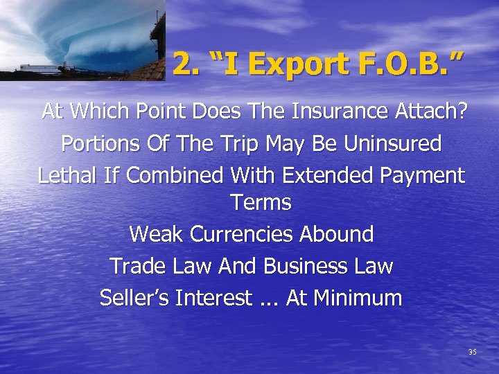 2. “I Export F. O. B. ” At Which Point Does The Insurance Attach? Portions Of The Trip May Be Uninsured Lethal If Combined With Extended Payment Terms Weak Currencies Abound Trade Law And Business Law Seller’s Interest. . . At Minimum 35