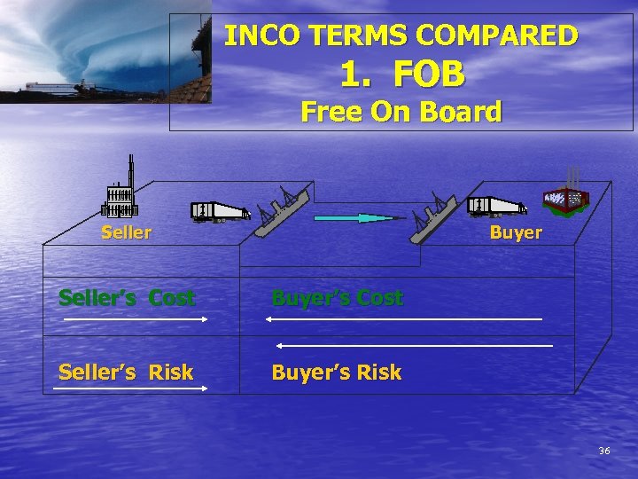 INCO TERMS COMPARED 1. FOB Free On Board Seller Buyer Seller’s Cost Buyer’s Cost Seller’s Risk Buyer’s Risk 36