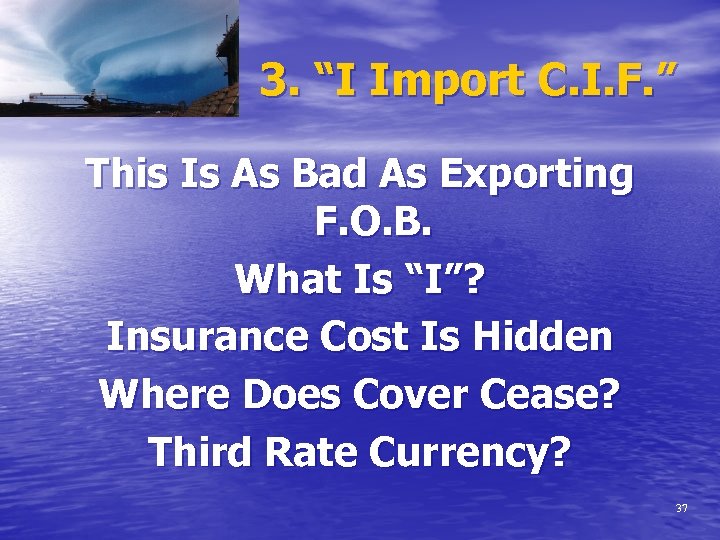 3. “I Import C. I. F. ” This Is As Bad As Exporting F. O. B. What Is “I”? Insurance Cost Is Hidden Where Does Cover Cease? Third Rate Currency? 37