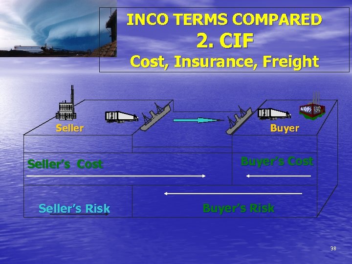 INCO TERMS COMPARED 2. CIF Cost, Insurance, Freight Seller’s Cost Seller’s Risk Buyer’s Cost Buyer’s Risk 38