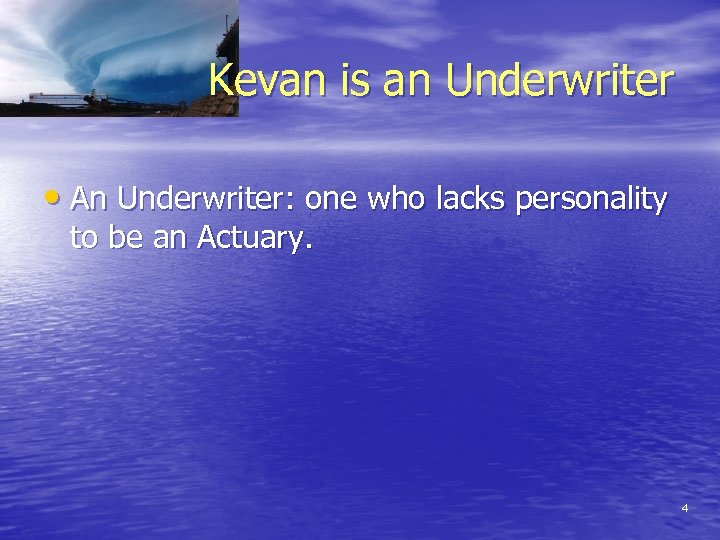 Kevan is an Underwriter • An Underwriter: one who lacks personality to be an Actuary. 4