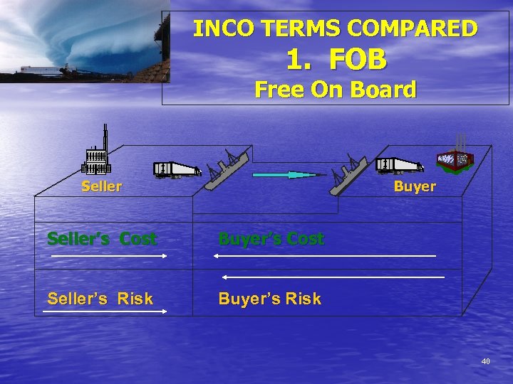 INCO TERMS COMPARED 1. FOB Free On Board Seller Buyer Seller’s Cost Buyer’s Cost Seller’s Risk Buyer’s Risk 40