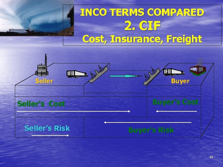 INCO TERMS COMPARED 2. CIF Cost, Insurance, Freight Seller’s Cost Seller’s Risk Buyer’s Cost Buyer’s Risk 42