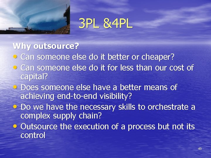 3 PL &4 PL Why outsource? • Can someone else do it better or cheaper? • Can someone else do it for less than our cost of capital? • Does someone else have a better means of achieving end-to-end visibility? • Do we have the necessary skills to orchestrate a complex supply chain? • Outsource the execution of a process but not its control 43