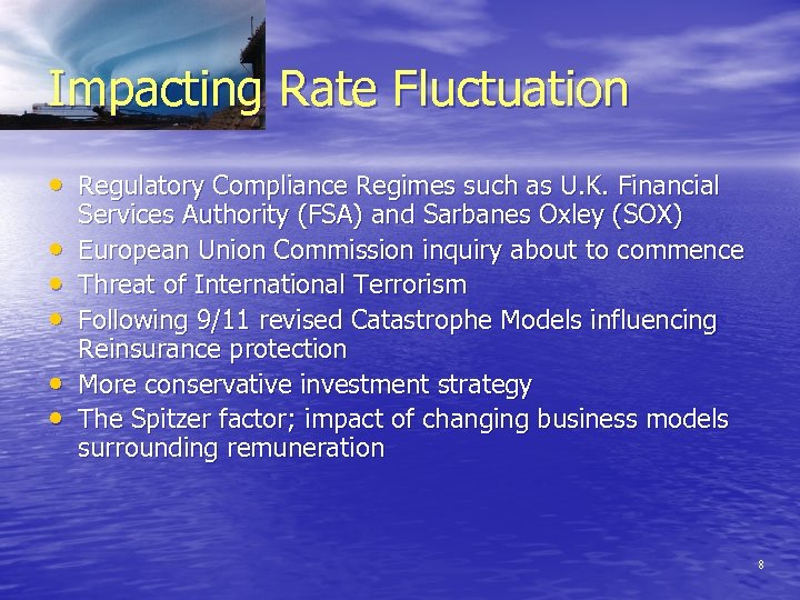 Impacting Rate Fluctuation • Regulatory Compliance Regimes such as U. K. Financial • • • Services Authority (FSA) and Sarbanes Oxley (SOX) European Union Commission inquiry about to commence Threat of International Terrorism Following 9/11 revised Catastrophe Models influencing Reinsurance protection More conservative investment strategy The Spitzer factor; impact of changing business models surrounding remuneration 8