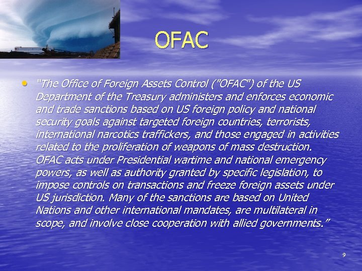 OFAC • “The Office of Foreign Assets Control ("OFAC") of the US Department of the Treasury administers and enforces economic and trade sanctions based on US foreign policy and national security goals against targeted foreign countries, terrorists, international narcotics traffickers, and those engaged in activities related to the proliferation of weapons of mass destruction. OFAC acts under Presidential wartime and national emergency powers, as well as authority granted by specific legislation, to impose controls on transactions and freeze foreign assets under US jurisdiction. Many of the sanctions are based on United Nations and other international mandates, are multilateral in scope, and involve close cooperation with allied governments. ” 9