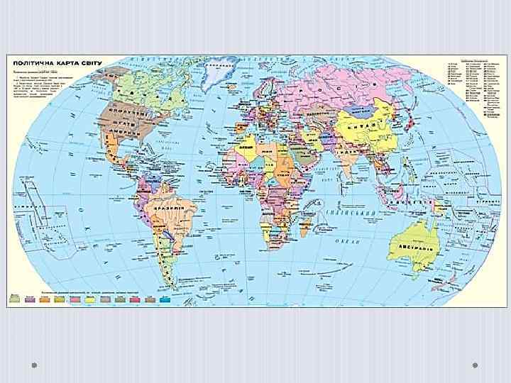 Політичнакарта світу– це географічна карта Землі, на якій відображені всі країни і держави світу, їх кордони і столиці, деякі ніші географічні об'єкти, що мають важливе політичне значення. На сучаснійполітичній карті світу близько 230 країн і територій, з них – 193 держави. Динамічність (постійні зміни) – основна властивість політичної карти.