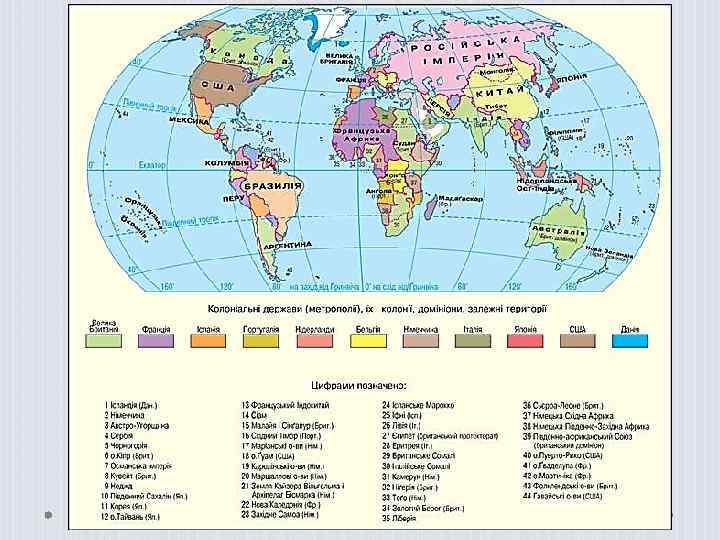Періоди формування сучасної політичної карти світу. І період Давній Єгипет, Давня Греція, Карфаген, Римська імперія, Месопотамія, Давній Китай, Давня Індія … Античний (стародавній до 5 ст. н. е. ) ІІ період Середньовічний (5 -15 ст. нашої ери) Феодальна роздробленість (Київська Русь, Московська держава, Візантія, Іспанія, Португалія, Англія. . ) ІІІ період. Колоніальний (15 -20 ст. ) 1. Перші колоніальні імперії 2. Нові колоніальні імперії: • Іспанії (в Латинській Америці, Африці) • Португалії (Бразилія, в Африці) • Великої Британії (Північна Америка, Австралія, Нова Зеландія, Індія, в Африці) • Франції (в Африці, Південно-Східна Азія) 1776 – незалежність США 1870, 1871 – об'єднання Італії і Німеччини Розвиток капіталізму в Японії Зростання колоніальних імперій Великої Британії та Франції