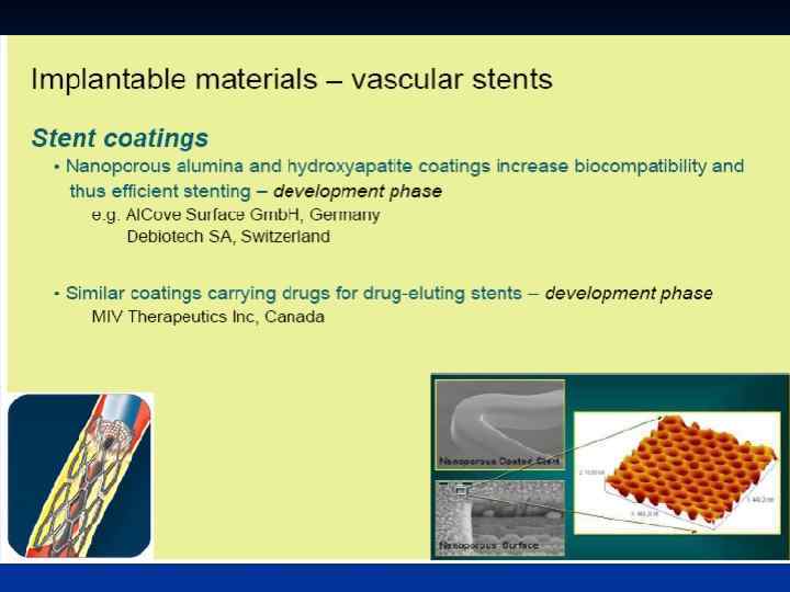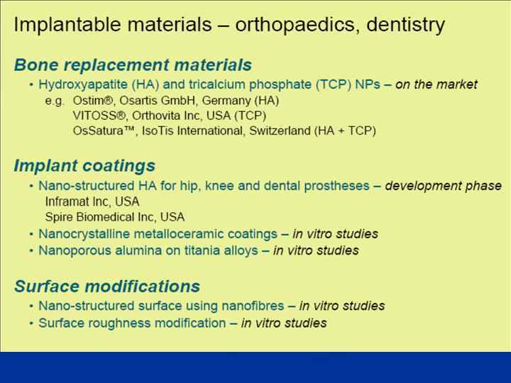 НАНОСТРУКТУРОВАНІ МАТЕРІАЛИ НАНОПОРИСТІ МАТЕРІАЛИ Проростання тканинами, транспорт НАНОКРИСТАЛІЧНІ МАТЕРІАЛИ Фізичні, електричні, оптичні, механічні властивості НАНОПІДСИЛЕНІ Механічні властивості МОДИФІКОВАНІ ПОВЕРХНІ Біосумісність