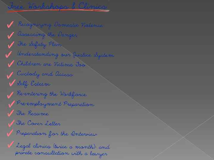 SWC SERVICES Information, Referral, and Support Services Crisis Support and Advocacy Services Public Education and Outreach Programs Violence Prevention Economic Independence LEGAL & RESEARCH free legal clinics Legal Workshops Consult with a Lawyer Computer and Internet Access Library Resources COMMUNITY Clothing Depot and Household Items Drop-in/Social Space Meeting place for Support Groups Training for Students/Volunteers Sister's Offering Support