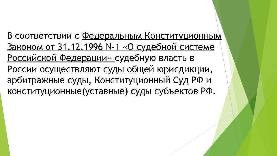 В соответствии с Федеральным Конституционным Законом от 31. 12. 1996 N-1 «О судебной системе Российской Федерации» судебную власть в России осуществляют суды общей юрисдикции, арбитражные суды, Конституционный Суд РФ и конституционные(уставные) суды субъектов РФ.