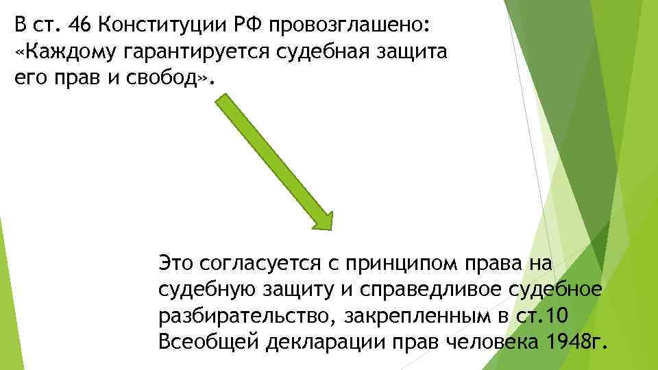 В ст. 46 Конституции РФ провозглашено: «Каждому гарантируется судебная защита его прав и свобод» . Это согласуется с принципом права на судебную защиту и справедливое судебное разбирательство, закрепленным в ст. 10 Всеобщей декларации прав человека 1948 г.