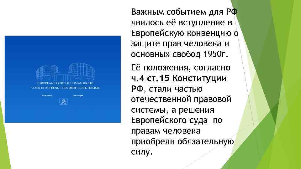Важным событием для РФ явилось её вступление в Европейскую конвенцию о защите прав человека и основных свобод 1950 г. Её положения, согласно ч. 4 ст. 15 Конституции РФ, стали частью отечественной правовой системы, а решения Европейского суда по правам человека приобрели обязательную силу.