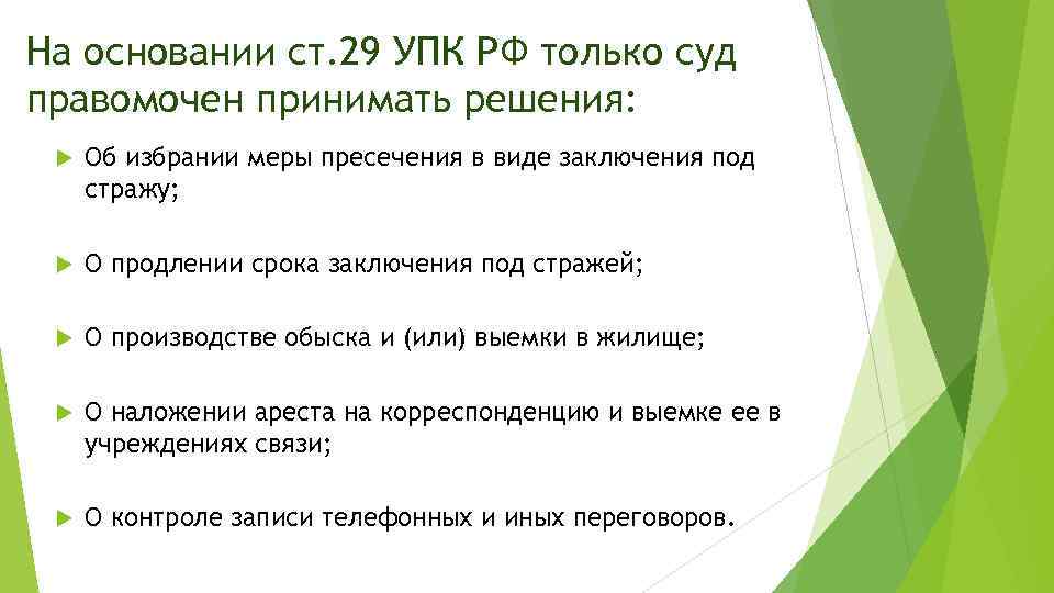 На основании ст. 29 УПК РФ только суд правомочен принимать решения: Об избрании меры пресечения в виде заключения под стражу; О продлении срока заключения под стражей; О производстве обыска и (или) выемки в жилище; О наложении ареста на корреспонденцию и выемке ее в учреждениях связи; О контроле записи телефонных и иных переговоров.