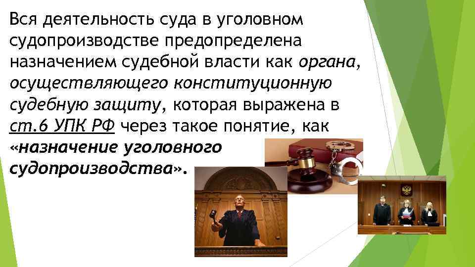 Вся деятельность суда в уголовном судопроизводстве предопределена назначением судебной власти как органа, осуществляющего конституционную судебную защиту, которая выражена в ст. 6 УПК РФ через такое понятие, как «назначение уголовного судопроизводства» .