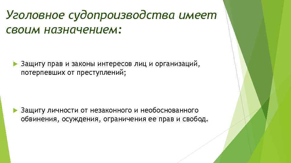 Уголовное судопроизводства имеет своим назначением: Защиту прав и законы интересов лиц и организаций, потерпевших от преступлений; Защиту личности от незаконного и необоснованного обвинения, осуждения, ограничения ее прав и свобод.