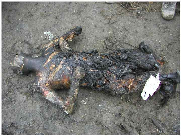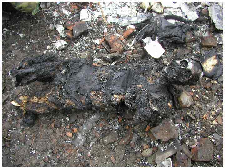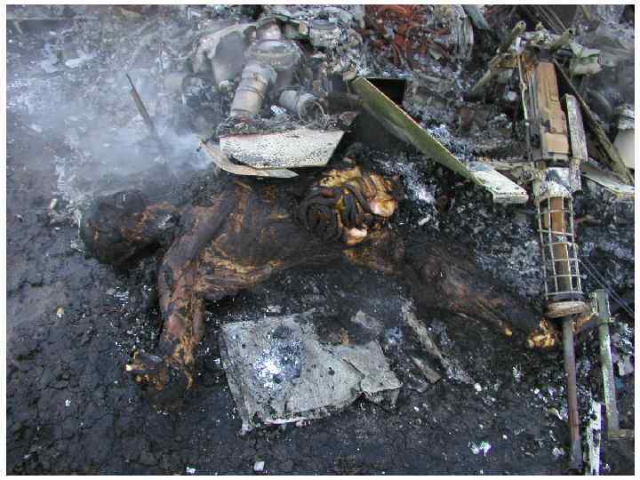 ПОВРЕЖДАЮЩИЕ ФАКТОРЫ И ХАРАКТЕР ПОВРЕЖДЕНИЙ ПРИ ТРАВМЕ ВНУТРИ САМОЛЕТА ПРИ ПАДЕНИИ ЕГО И УДАРЕ О ЗЕМЛЮ Взрывная волна является самым мощным повреждающим фактором, возникающим в результате взрыва горючего в топливных баках (общая масса останков, обнаруживаемых на месте катастрофы одноместного самолета, может быть от нескольких сотен граммов до 3 -7 кг; останки обнаруживаются как в самой воронке, так и разбросанными на площади радиусом до 300 -500 м; при взрыве в воздухе после касания земли останки людей, находившихся в самолете, оказываются разбросанными на расстояние до 3 км по направлению полета и до 1, 5 км в стороны от места взрыва) Термическое действие связано с пожаром, возникающим во время полета или после удара самолета о землю (иногда пожару предшествует взрыв, в этих случаях термическому воздействию подвергаются уже останки трупов) ü Термическое действие оказывают горячие жидкости (масло, выбрасываемое под давлением из поврежденного маслопровода) ü Ожоги возникают прижатии пострадавших деформировавшимися и сместившимися частями самолета к горячему двигателю