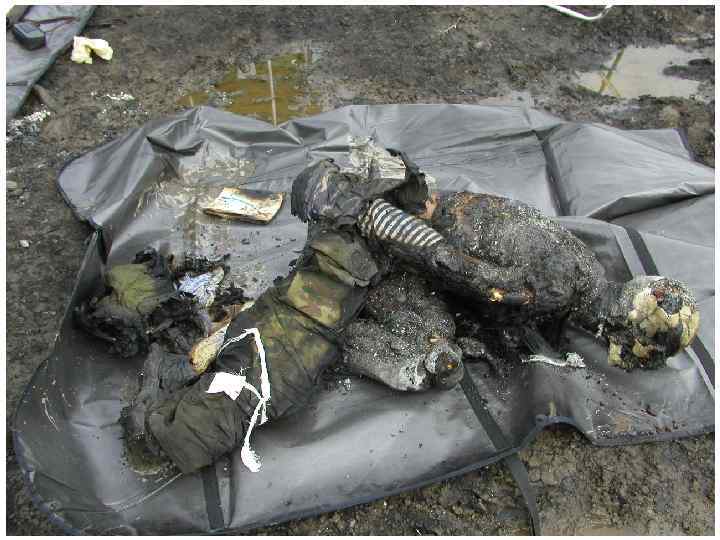 ОРГАНИЗАЦИЯ РАБОТЫ СУДЕБНО МЕДИЦИНСКИХ ЭКСПЕРТОВ При осмотре места происшествия (катастрофы) выясняется общий характер местности, место удара самолета о землю, расположение его обломков, а также останков экипажа и пассажиров (по характеру падения самолета и расположению останков на местности можно получить представление о действовавших повреждающих факторах и механизмах причинения телесных повреждений у пострадавших) Судебно медицинского эксперта особенно должно интересовать местонахождение обломков со следами биологического характера (пятнами крови, обрывками тканей тела, ущемленными в деформированных конструкциях) ü Непосредственным объектом осмотра на месте катастрофы являются трупы членов экипажа и пассажиров или их останки ü Определяется положение трупов на местности и относительно частей самолета (если трупы расчленены и отдельные части их разбросаны на значительной площади, выясняется положение каждой части тела по отношению к окружающим предметам; при падении самолета на лесистую местность трупы и их фрагменты следует искать не только на земле, но и на ветвях деревьев)