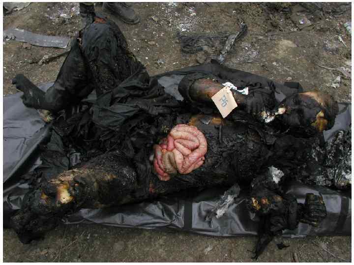 ОРГАНИЗАЦИЯ РАБОТЫ СУДЕБНО МЕДИЦИНСКИХ ЭКСПЕРТОВ Наружное исследование трупа по общепринятым в судебной медицине правилам. Изучая повреждения кожных покровов, сопоставляют их с повреждениями на одежде (одновременное образование) Выявляют признаки прижизненности ожоговой травмы (запах, явления мацерации кожи нефтепродуктами, имеющие некоторое внешнее сходство с прижизненными ожогами) Внутреннее исследование: 1) вскрывают полости и изучают органы и ткани до извлечения (локализация и характер повреждений внедрившимися обломками самолета, выраженность явлений сотрясения органов: от кровоизлияний в связочный аппарат и поверхностных разрывов паренхимы до частичного или полного отрыва органов); 2) изучают повреждения внутренних органов после их извлечения; 3) исследуют костные повреждения (в т. ч. рентгенография) 4) обязательны гистологическое и судебно химическое исследования (пропитывание останков керосином этому не препятствует)
