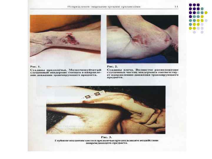 Динамика ссадины l l l до 12 часов - ссадина имеет вид блестящей розовой влажной поверхности (желтоватая или буроватая), слегка западающей по сравнению с окружающей неповрежденной кожей, 12 -24 часа - на поверхности ссадины формируется корка из лимфы с примесью крови. 1 -4 суток - корка возвышается (эпителизация от периферии к центру), но еще не отторгается. 4 -12 суток – края корки подрытые, затем корка отслаивается от периферии к центру ссадины и полностью отпадает. 2 -3 недели (до полугода) – депигментация кожи, место ссадины перестает отличаться от окружающей кожи