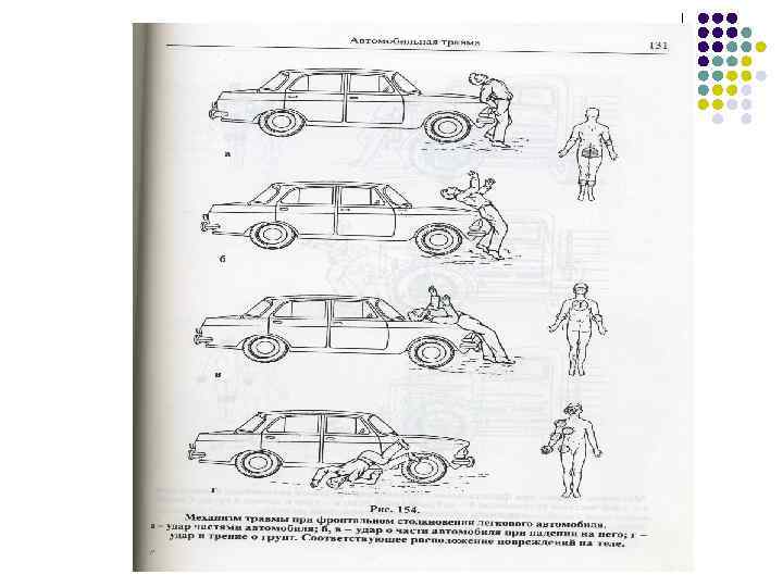 Повреждения, характерные для автотравмы l l отпечатки на поверхности тела протектора колеса автомашины сдавливания отдельных частей тела с их уплотнением вследствие переломов костей следы волочения, имеющие вид множественных параллельных царапин на фоне осадненной кожи, безоскольчатые переломы голени или бедер ("бамперпереломы")