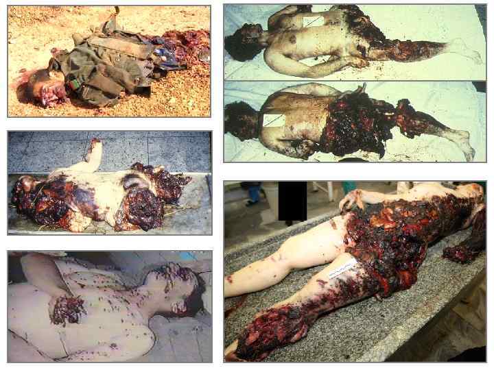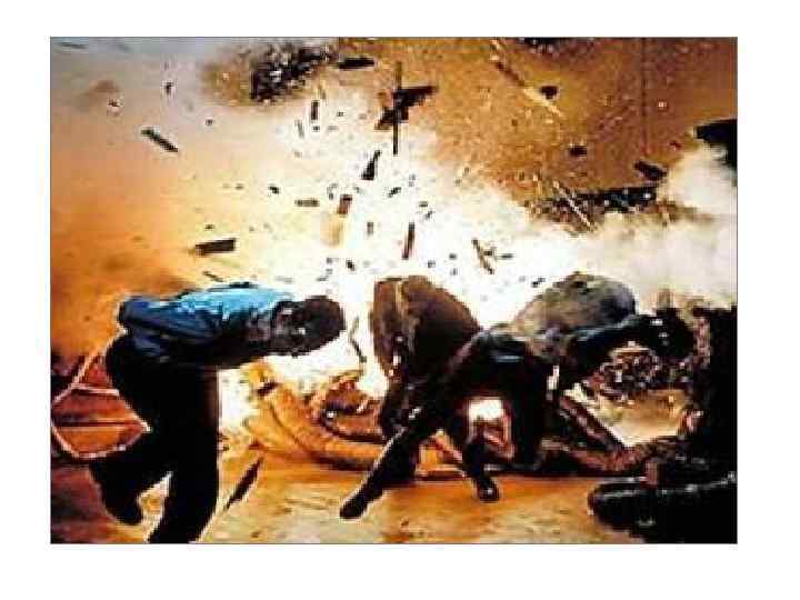ОБЩИЕ ОСОБЕННОСТИ ПОВРЕЖДЕНИЙ, ВОЗНИКАЮЩИХ В РЕЗУЛЬТАТЕ ВЗРЫВА q множественность q сочетанность и комбинированность q одностороннее расположение q морфологическое разнообразие q наличие обширных разрушений и отрывов q закрытые повреждения внутренних органов q преимущественно открытый характер переломов q признаки термического и химического воздействия q преимущественно слепой и касательный характер ранений q радиальное направление раневых каналов q наличие частиц ВВ и осколков в раневых каналах q бароакустическая травма (легких, среднего уха, придаточных полостей) и временное ослепление в результате световой