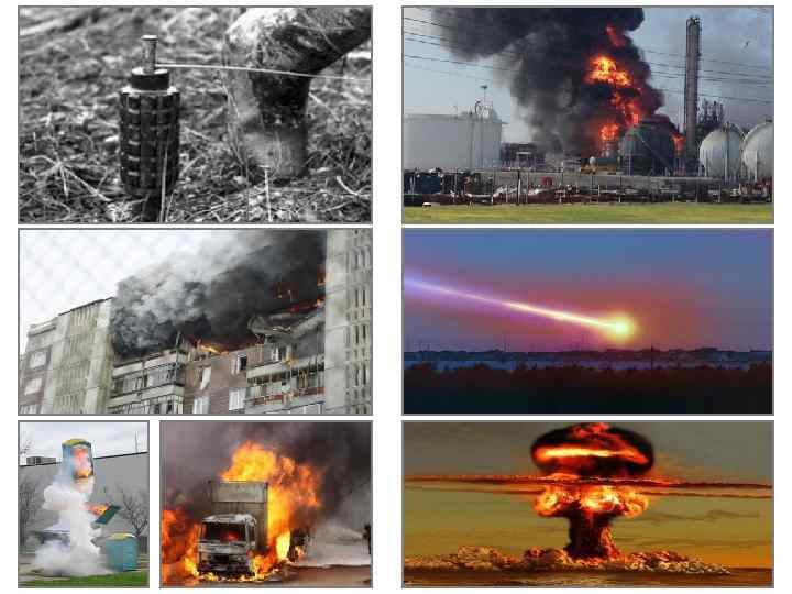 ИСХОДНЫМИ ВИДАМИ ЭНЕРГИИ ВЗРЫВА МОГУТ БЫТЬ физическая, химическая и ядерная К разновидностям физических взрывов относят: 1) кинетический (метеорит); 2) тепловой (взрыв парового котла, автоклава); 3) электрический (молния, электрический разряд); 4) упругое сжатие (землетрясение, замерзание воды в резервуаре, разрыв автомобильной шины и проч. ); 5) внутриядерная (в результате цепной реакции при быстром делении тяжелых атомных ядер); 6) термоядерная (при слиянии ядер атомов легких элементов с образованием ядер более тяжелых металлов) Химический взрыв – это импульсный экзотермический химический процесс перестройки (разложения) молекул твердых или жидких взрывчатых веществ, с превращением их в молекулы взрывных газов (возникает очаг высокого давления и выделяется большое количество тепла)