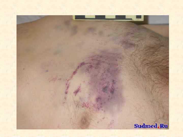 Кровоподтек – участок окрашивания кожи в цвет крови, излитой в подкожную жировую клетчатку • Судебно-медицинское значение • 1. Факт травмы • 2. Локализация воздействия (прямые и отдаленные) • 3. Давность травмы (припухлость, цветение) • 4. Механизм травмы (тупой предмет – разрыв сосудов, прокол – прокол сосудов, перелом кости с разрывом сосудов) • 5. Идентификация повреждающего объекта
