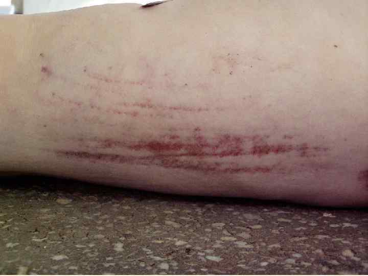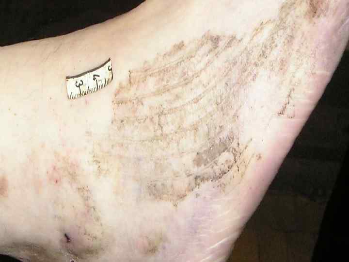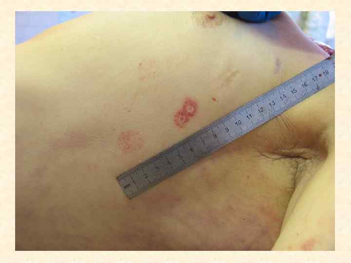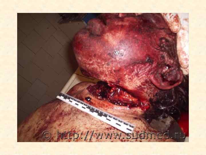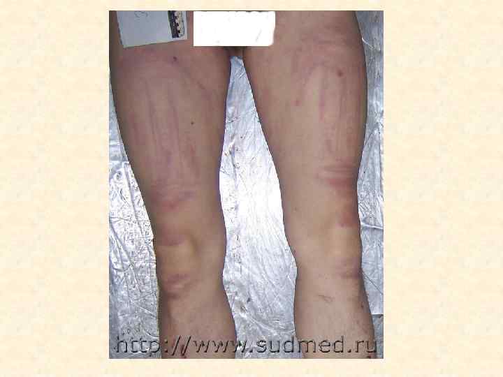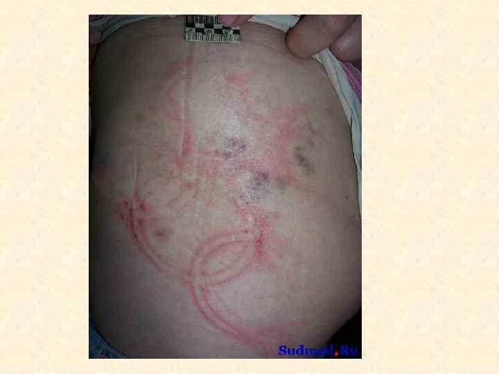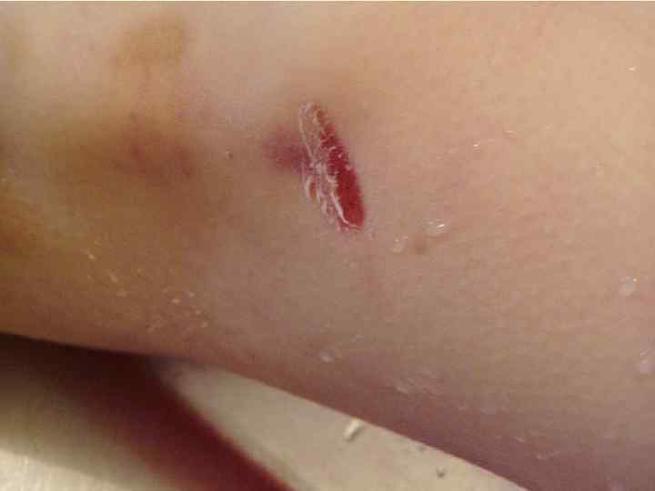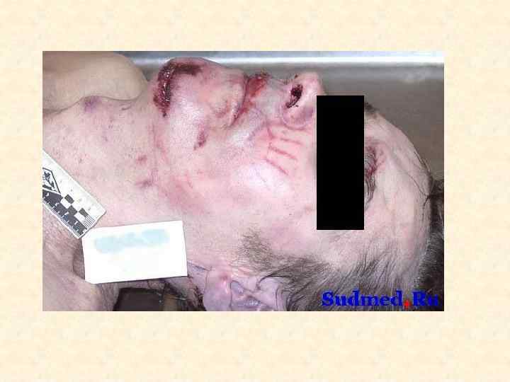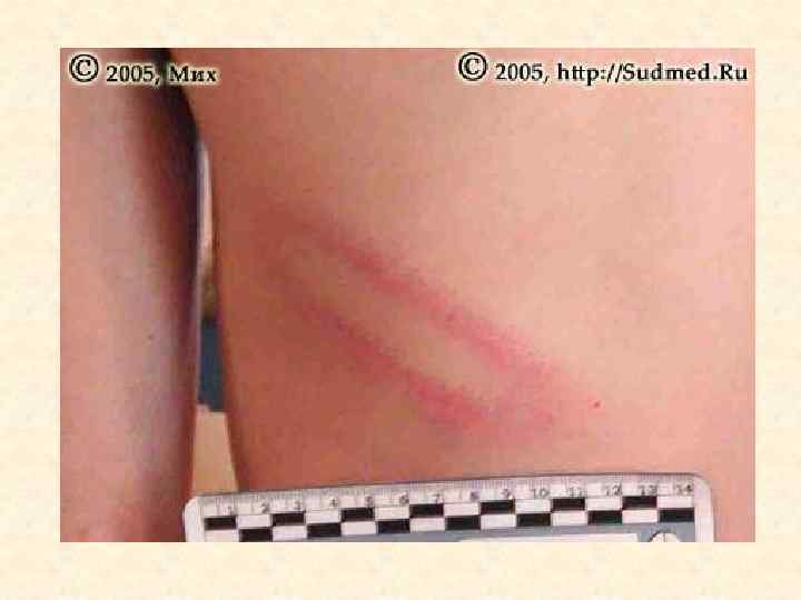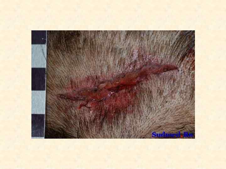 Ссадина – поверхностное повреждение кожи до сосочкового слоя дермы • • Судебно-медицинское значение 1. Факт травмы 2. Локализация воздействия 3. Давность травмы 4. Механизм травмы (тупой предмет, действующий под острым углом; трение) 5. Направление воздействия (ссадина в начале шире, чем в конце) 6. Угол воздействия (чем ссадина длиннее, тем угол воздействия острее; определяется по соотношению длины и ширины ссадины) 7. Идентификация тупого предмета в случаях «штампованных ссадин» , например от пряжки ремня, кольца-печатки.