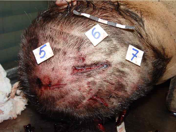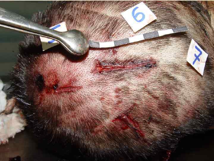 Свойства ушибленной раны • • • 1. Края неровные 2. Края осадненные 3. Стенки неровные 4. Дно с карманами под краями раны 5. В дне соединительно-тканные поперечные перемычки • 6. Луковицы волос в стенках раны выстоят в просвет, не пересечены • 7. Концы закругленные или ветвистые