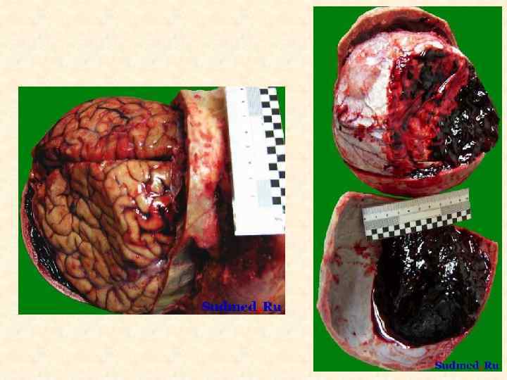 УШИБ • 1. Факт травматизации, результатом которого являются кровоподтек, ссадина, ушибленная рана • 2. Повреждение внутреннего органа – мозга, сердца, легких, почек, селезенки, печени, кишечника, желудка, мочевого пузыря. • Морфологическим субстратом являются: разрывы, кровоизлияния, детрит, отек.
