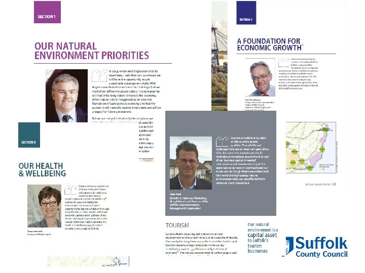 Why we did it • • • Suffolk sector wanted to speak with one voice at a strategic level Period of unprecedented ecological challenge: Habitat loss, over-exploitation, pollution & non-native invasive spp. State of Nature of spp 60% declining Not everyone shares a moral imperative to save nature Many still see natural environment as a block on growth Health crisis also, and lots of evidence about the value of nature to both physical and mental wellbeing Legal duties! • NEWP SCC keen to be a strategic champion