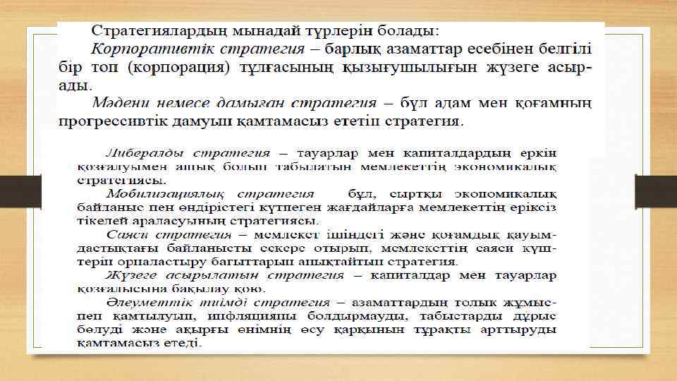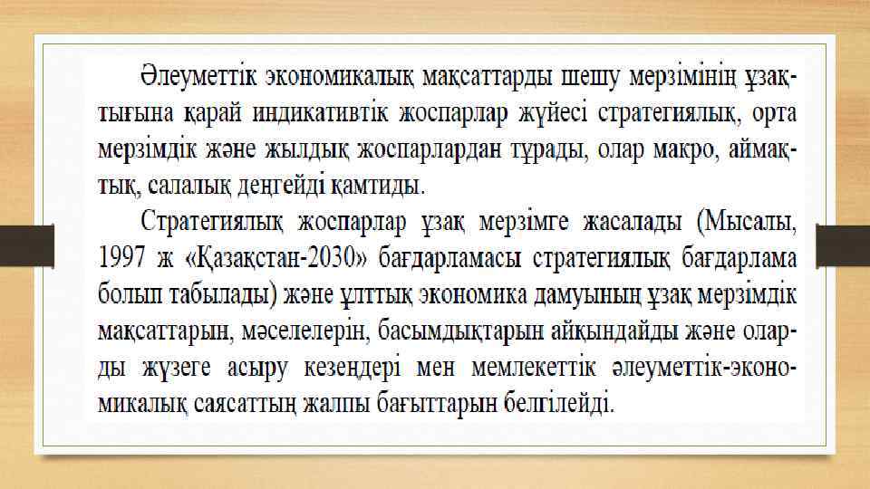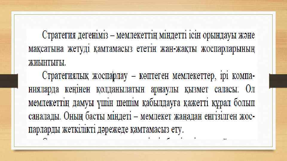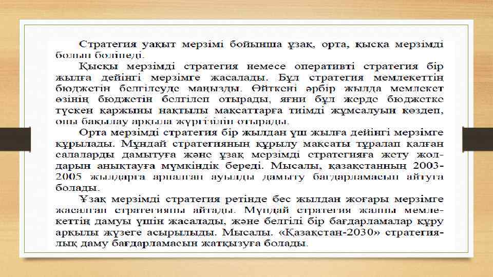 3. Стратегиялық жоспарлау методологиясы ұғымы және стратегияның түрлері Бүгінгі таңда мемлекеттік макроэкономикалық жоспарлаудың: • бюджеттік, • стратегиялық, • индикативті • директивті формалары болады.