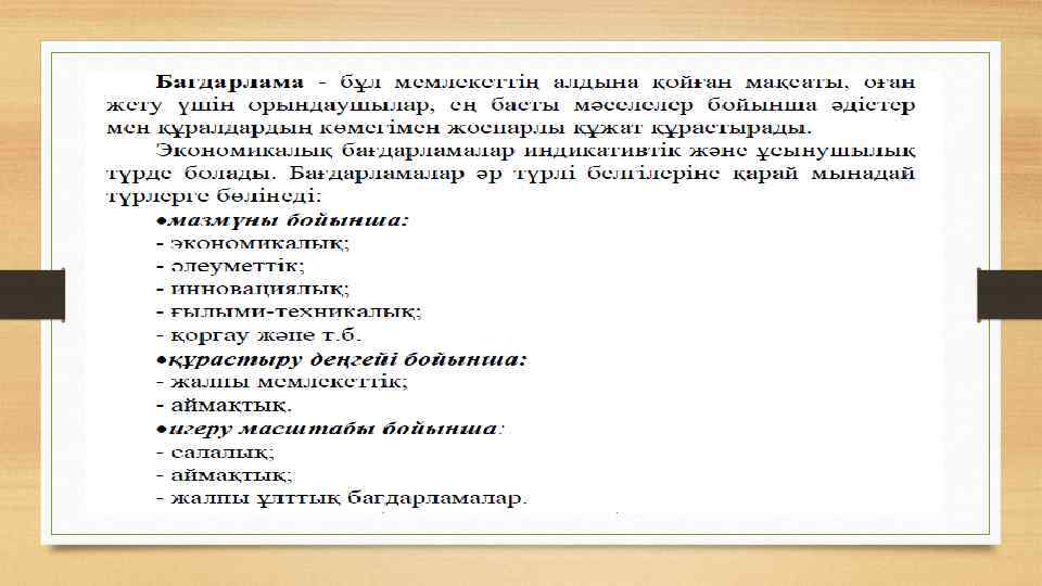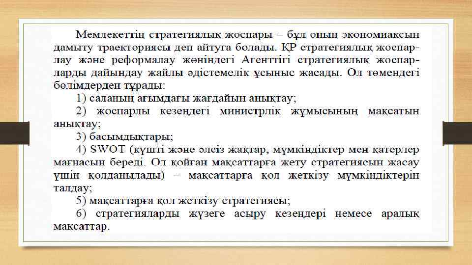 Дәрістің мақсаты: Экономикалық болжаудың ғылыми-методологиялық негізі; мемлекеттің ұлттық бағдарламасы, мемлекеттік стратегияны іске асыру негізі; стратегиялық жоспарлау методологиясын және стратегияның түрлерін талқылау. Дәріс жоспары: • 1. Экономикалық болжаудың мәні, мағынасы және ғылымиметодологиялық негізі. • 2. Мемлекеттің ұлттық бағдарламасы экономиканың басыңқы бағыттарымен дамуының мемлекеттік стратегиясын іске асыру негізі мен халық шаруашылығы жоспарының құрамды бөлігі ретінде. • 3. Стратегиялық жоспарлау методологиясы ұғымы және стратегияның түрлері
