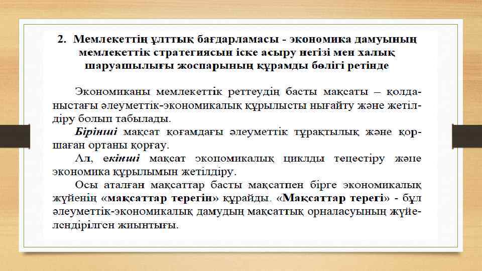 1. Экономикалық болжаудың мәні, мағынасы және ғылымиметодологиялық негізі • Экономиканы болжау мен жоспарлау экономиканы мемлекеттік реттеудің негізгі механизмі және олардың экономиканы басқаруда алатын орны зор. • Мемлекет тиімді реттеуді атқаруы үшін жоғары деңгейде сапалы болжау жасауы қажет. • Экономикалық болжаудың мақсаты – тұрақты экономикалық өсуді, толық жұмыспен қамтыуды қамта-масыз ету, инфляцияна бәсеңдету және т. б. болып табылады. • Болжауды жасауда екі әдіс қолданылады: Ø Біріншісі микроэкономикалық – бұл талдауға және жеке жоспарлар мен фирманың болжауына негізделетін әдіс. Бұл әдіс бойынша, жиналған мәліметтер қорытындыланады және мемлекеттік сектор бойынша есептеулермен бірге экономика дамуының басты бағдарламаларын жасауға негіз бола алады. Сонымен қатар мемлекеттік және жеке инвестициялық бағдарламалар да жасалады. Ø Екіншісі макроэкономикалық талдауға негізделген және жалпы мақсаттарды айқындауға бағытталып, оған жету міндеттілігіне негізделген әдіс.