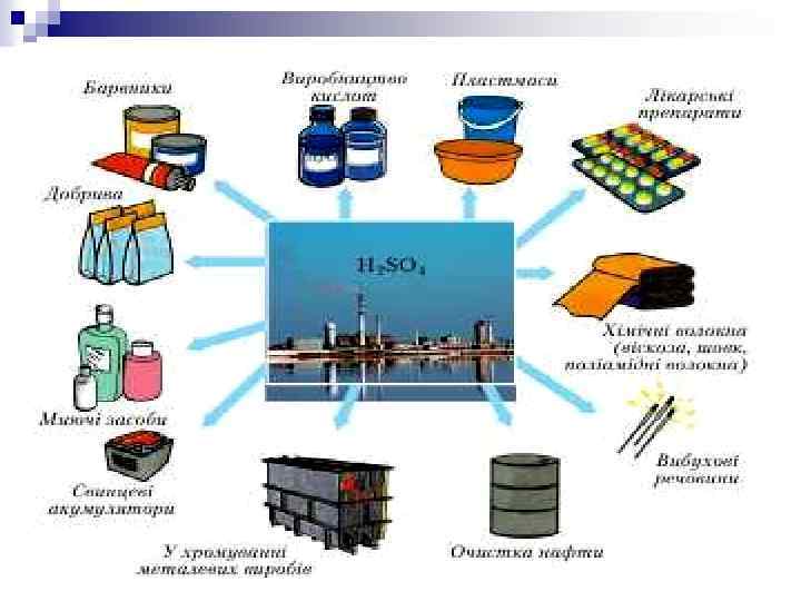 ВИСНОВКИ Сульфатна кислота H 2 SO 4 — безбарвна оліїста рідина без запаху, яка необмежено розчиняється у воді. Це сильна й нелетка двохосновна кислота. n Вона реагує з металами, основними й амфотерними оксидами, основами, амфотерними гідроксидами, а також солями з утворенням сульфатів. n Сульфатну кислоту та її солі широко n