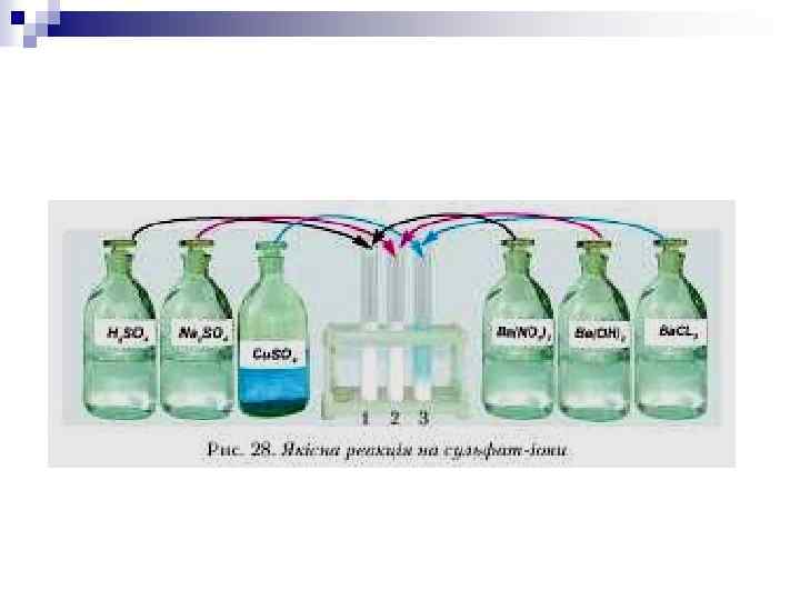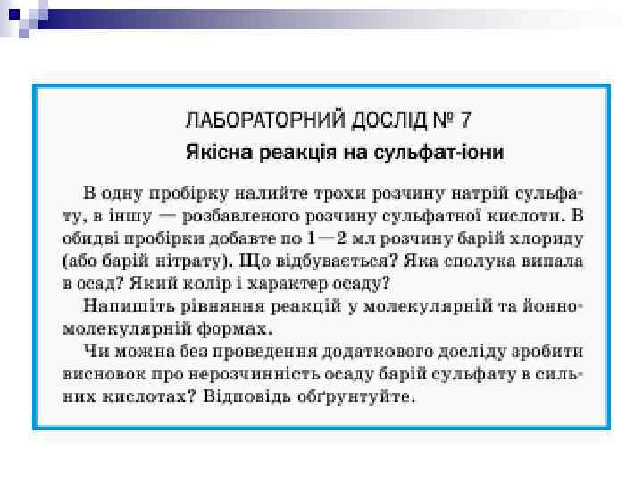 Демонстрації: n n n 5. Спалювання сірки і доведення кислотного характеру утвореного оксиду. 6. Виділення теплоти під час розчинення у воді концентрованої сульфатної кислоти. 7. Водовідбірні властивості концентрованої сульфатної кислоти (дія на цукор і папір). 8. Якісна реакція на сульфат-іон. Лабораторні досліди: 4. Ознайомлення зі зразками природних сполук Сульфуру. 5. Виявлення сульфат-іонів у розчині.
