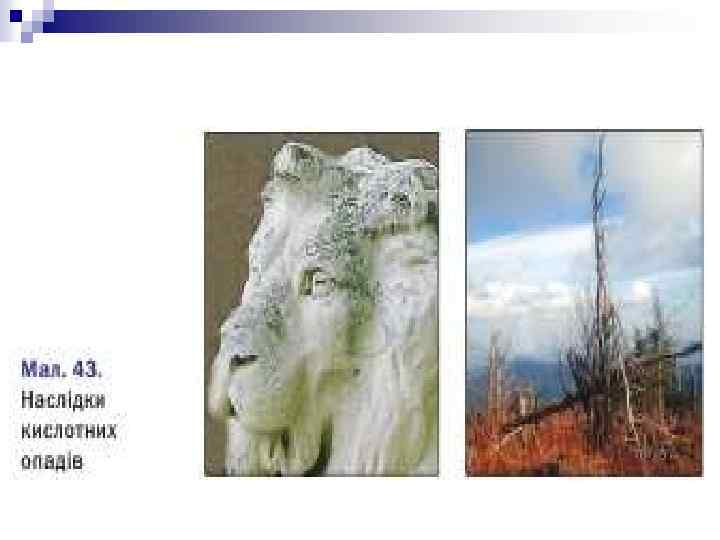 Поняття про кислотні дощі та причини їх виникнення. n n n Чи доводилося вам спостерігати, як після довгоочікуваного літнього дощу рослини замість того, щоб рости й давати врожай, жовкнуть, в’януть і навіть гинуть (досить часто це трапляється з огірками)? З великою ймовірністю можна стверджувати, що дощ був не звичайний, а кислотний, і завдав шкоди рослинам. Кислотні дощі пошкоджують листки, руйнують їх захисні воскові покриви, через що ті стають легкопроникними для комах, шкідливих грибів і мікроорганізмів. Окрім рослин, кислотні дощі завдають шкоди тваринам, водоймам, ґрунтам. Хімічний аналіз кислотних дощів показує наявність у них сульфатної та нітратної кислот. Поява цих речовин — наслідок розглянутих хімічних перетворень оксидів Сульфуру і Нітрогену в атмосфері. Кислотний дощ— це дощ, що містить певну кількість кислот, утворених унаслідок взаємодії з водою наявних у повітрі таких забруднювачів, як оксиди Сульфуру і Нітрогену. Щороку внаслідок спалювання твердого палива, роботи двигунів внутрішнього згорання, промислових викидів заводів по виробництву сульфатної і нітратної кислот концентрація цих оксидів у повітрі збільшується. Тому кислотні дощі створюють реальну загрозу людині, рослинному й тваринному світу.
