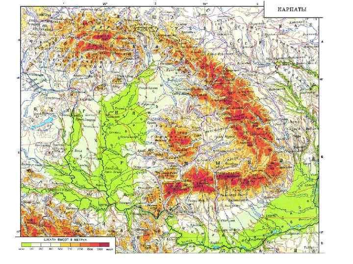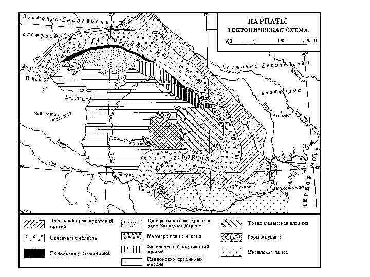 Карпатська гірська споруда (східна частина) • Склад: Карпатська покривно складчаста споруда, Передкарпатський прогин, Закарпатська западина; • Характерною рисою є зональність структур, які простягаються через весь регіон з північного заходу на південний схід, та наявність насувів (скиб) з амплітудою горизонтального переміщення 15 20 км у напрямку на північний схід; • Головні елементи Карпатської покривно складчастої споруди: Скибовий (Зовнішній) покрив, Центральна (Кросненська) синклінальна зона, Чорногорсько Полонинська антиклінальна зона; Рахівський масив, Вулканічні Карпати; • Передкарпатський прогин складається з Покутсько Бориславської, Самбірської та Більче Волцької зон; • Закарпатська западина поділяється Вулканічним хребтом на Солотвинську і Чопську (Мукачівську) западини.
