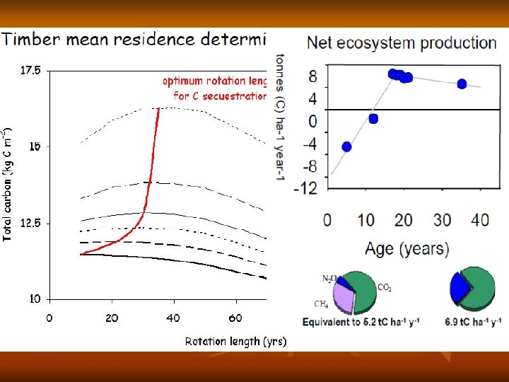 Forests n n n Old-growth forests still take up carbon; Highest carbon uptake in forest converting to natural state (dead wood), along with highest biodiversity; Long-term carbon storage opposes maximum carbon substitution; Carbon losses after clearcut and during establishment of plantations on soil rich in labile carbon may need 10 or more years to be compensated by NEE Forestry on peat/peaty soils is at best climate-neutral (CH 4, N 2 O)