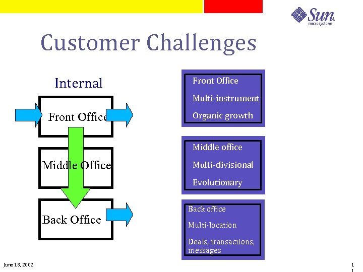 Customer Challenges Internal Front Office Multi-instrument Front Office Organic growth Middle office Middle Office Multi-divisional Evolutionary Back Office Back office Multi-location Deals, transactions, messages June 18, 2002 1