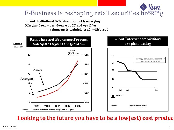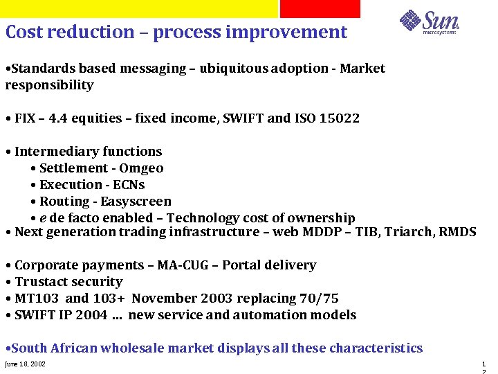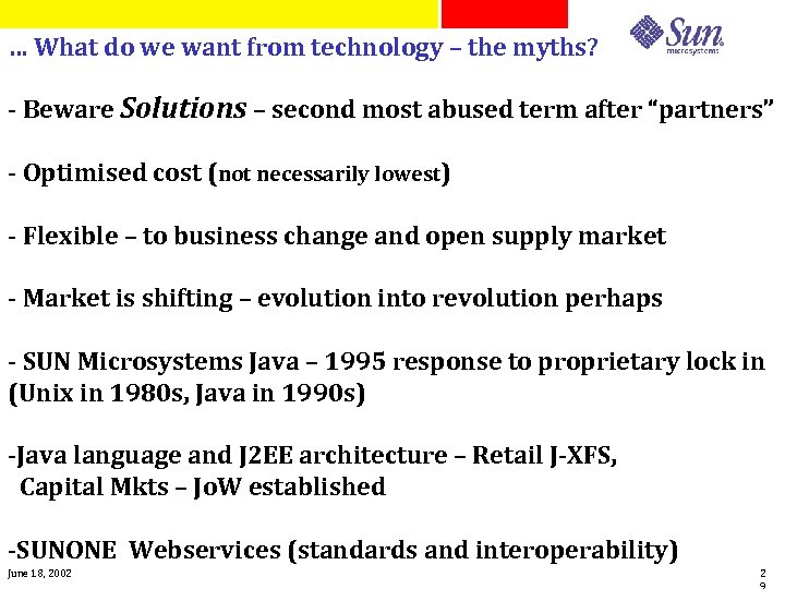 … What do we want from technology – the myths? - Beware Solutions – second most abused term after “partners” - Optimised cost (not necessarily lowest) - Flexible – to business change and open supply market - Market is shifting – evolution into revolution perhaps - SUN Microsystems Java – 1995 response to proprietary lock in (Unix in 1980 s, Java in 1990 s) -Java language and J 2 EE architecture – Retail J-XFS, Capital Mkts – Jo. W established -SUNONE Webservices (standards and interoperability) June 18, 2002 2