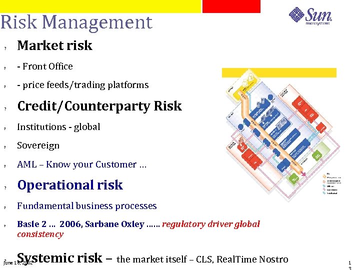 Risk Management ? Market risk ? - Front Office ? - price feeds/trading platforms ? Credit/Counterparty Risk ? Institutions - global ? Sovereign ? AML – Know your Customer … ? ? ? Operational risk Fundamental business processes Basle 2 … 2006, Sarbane Oxley …… regulatory driver global consistency Systemic risk – the market itself – CLS, Real. Time Nostro ? June 18, 2002 1