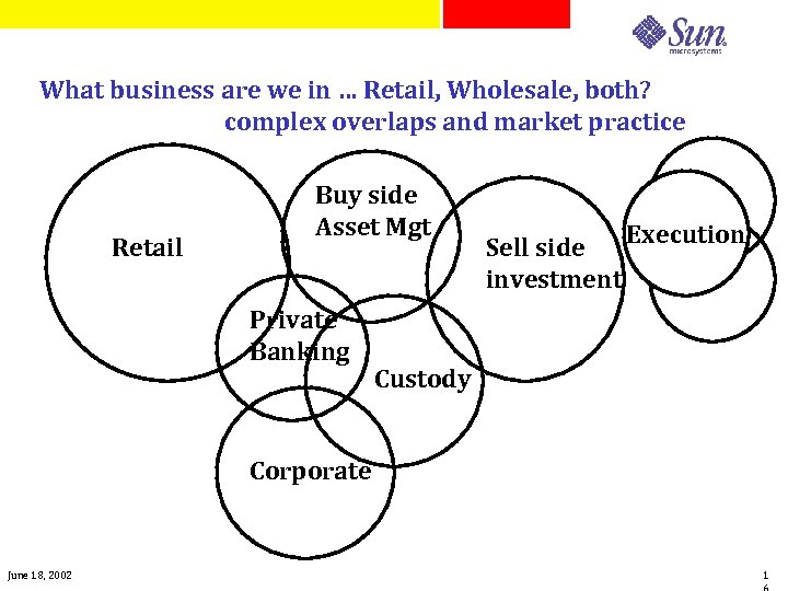 What business are we in … Retail, Wholesale, both? complex overlaps and market practice Retail Buy side Asset Mgt Private Banking Execution Sell side investment Custody Corporate June 18, 2002 1