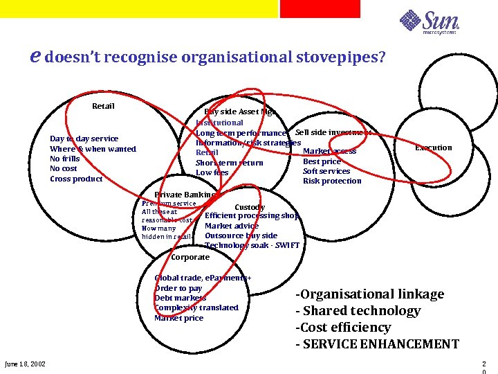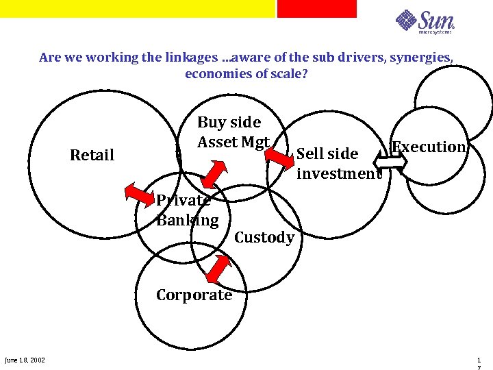 Are we working the linkages …aware of the sub drivers, synergies, economies of scale? Retail Buy side Asset Mgt Private Banking Execution Sell side investment Custody Corporate June 18, 2002 1